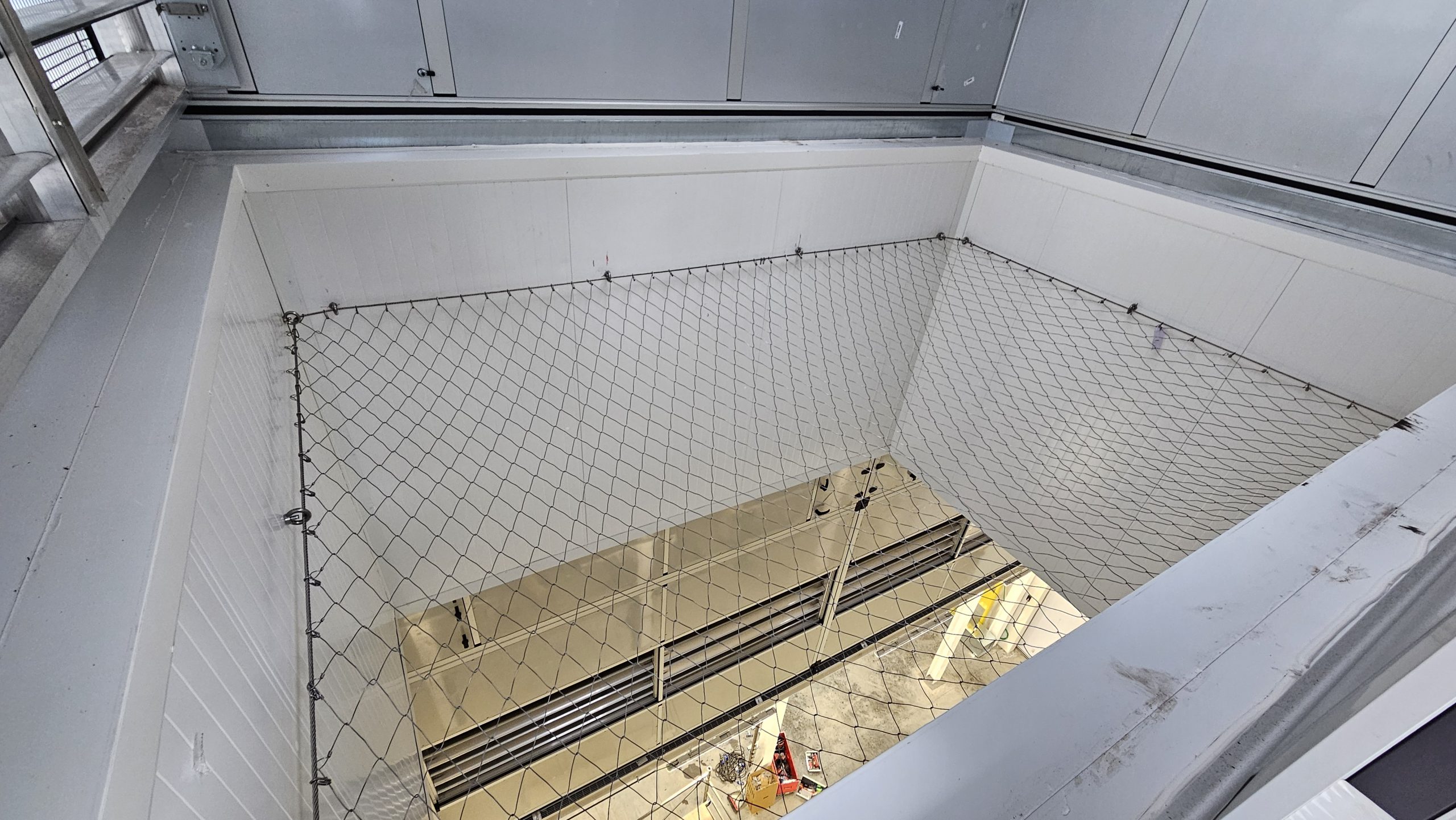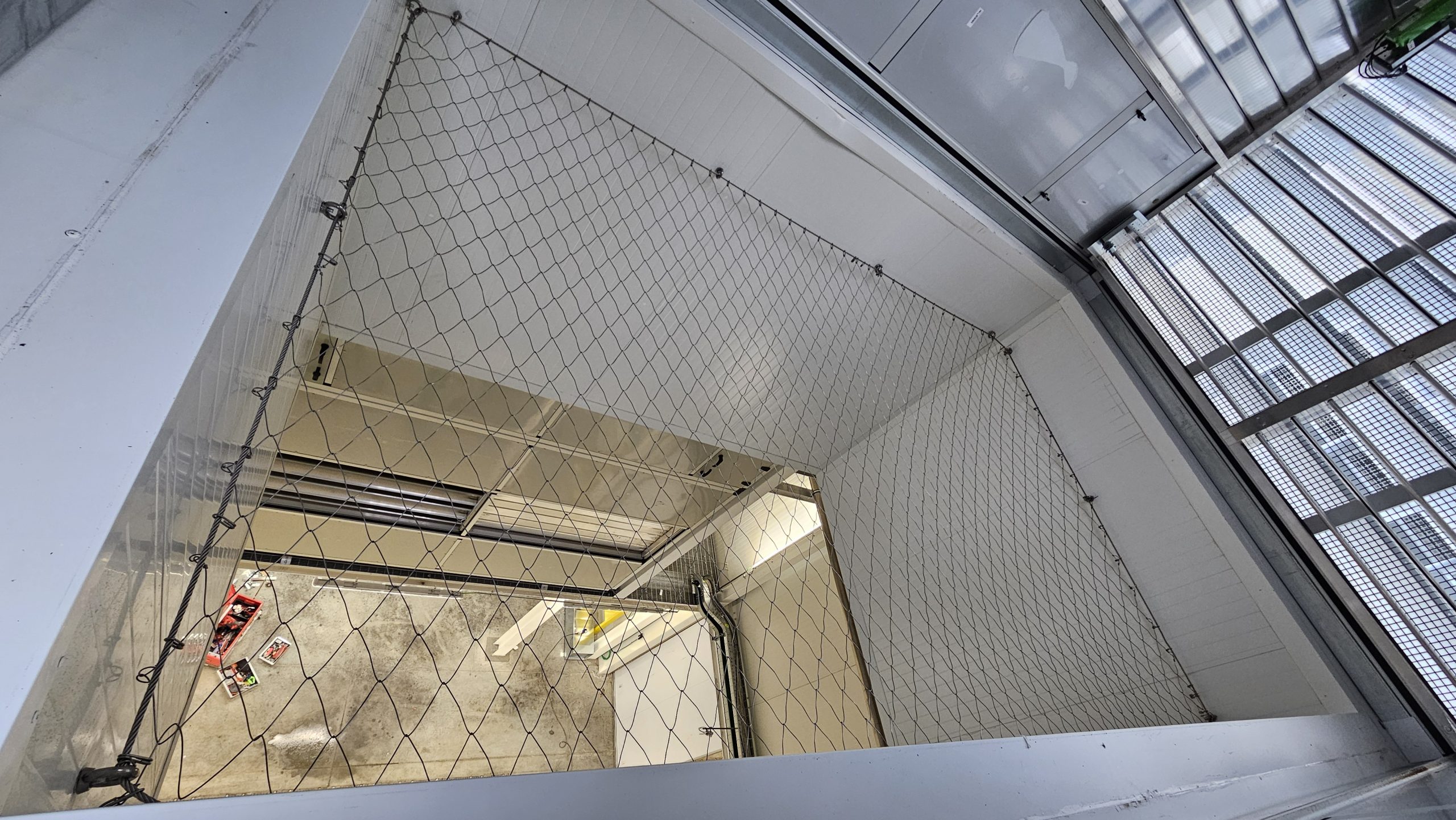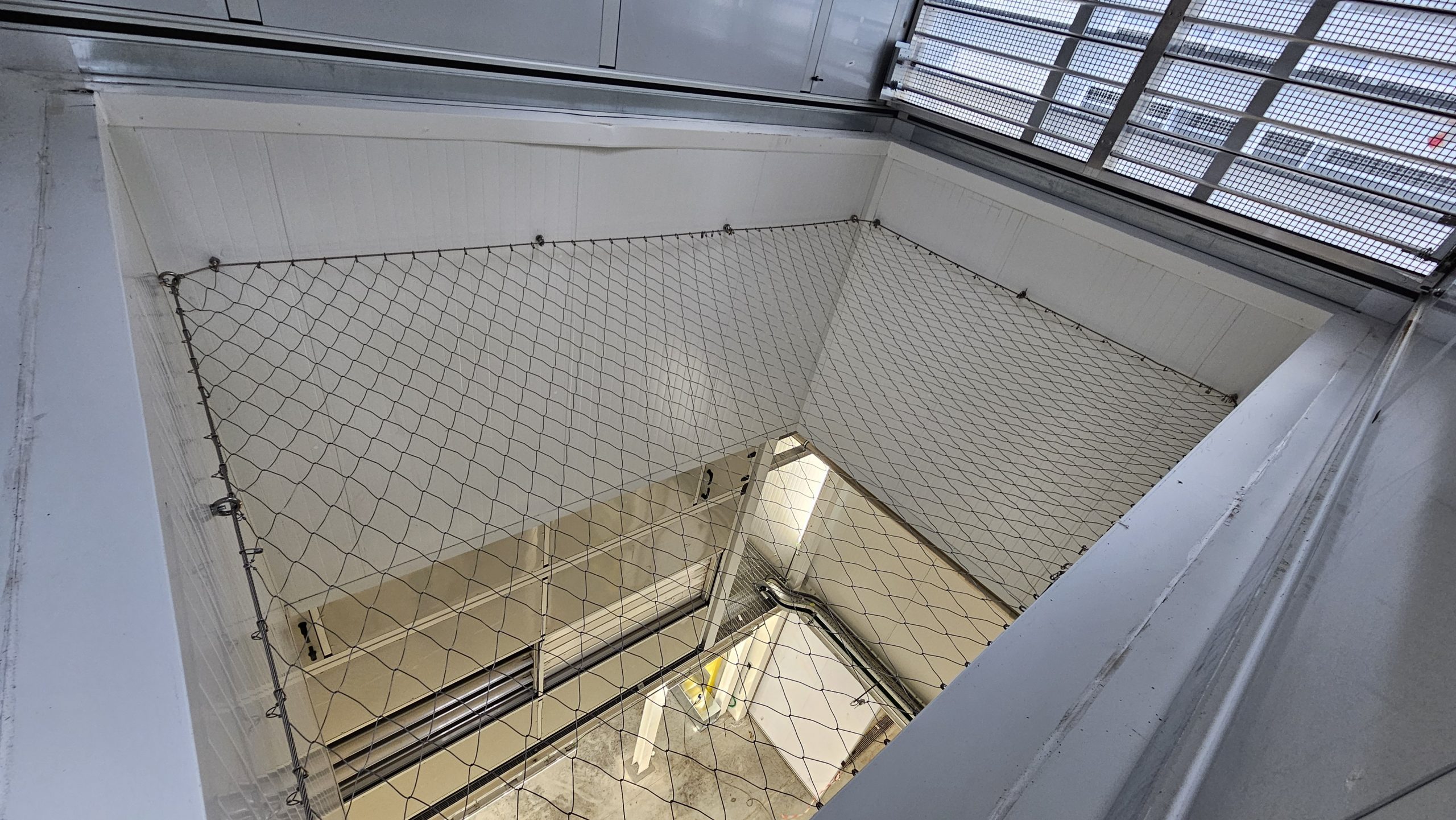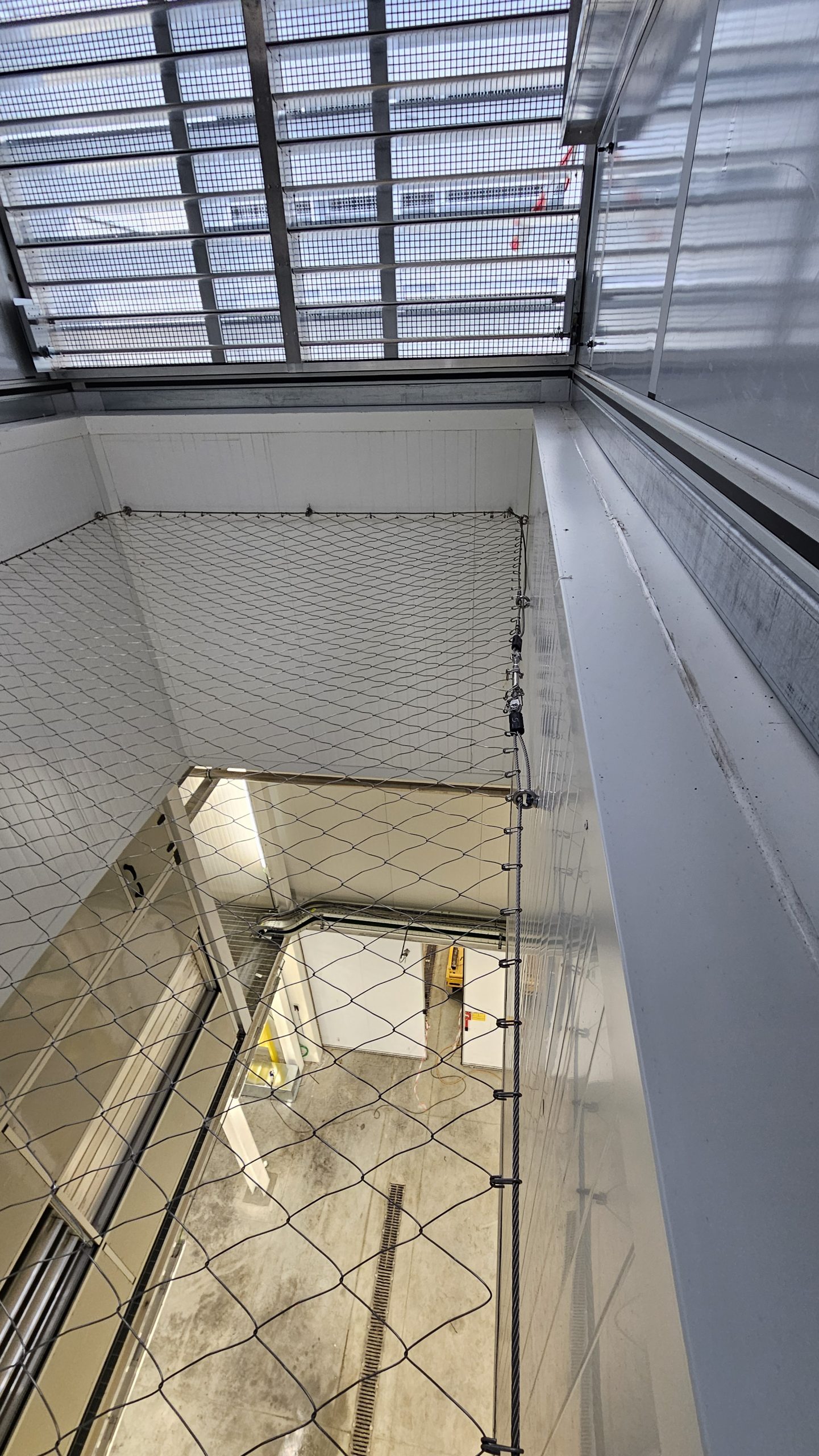 Situazione: Sono presenti in copertura lucernari in policarbonato sfondabili, per esigenze manutentive la copertura doveva essere messa in sicurezza con protezione collettiva permanente contro la caduta dall’alto. L’esigenza è stata di mettere in sicurezza i lucernari con rete anticaduta a misuira ed è stato utilizzato il sistema di protezione collettiva permanente con rete DeltaxSafe, fissato a mezzo GOLFARE M12 E FUNE PERIMETRALE alla struttura del basamento dei lucernari. Sono stati messi in sicurezza circa 20 lucernari con rete Deltaxsafe rendendo la copertura accessibile in sicurezza. La rete metallica anticaduta permanente deltaxsfe viene prodotta in pannelli modulari a misura giuntabili in opera.