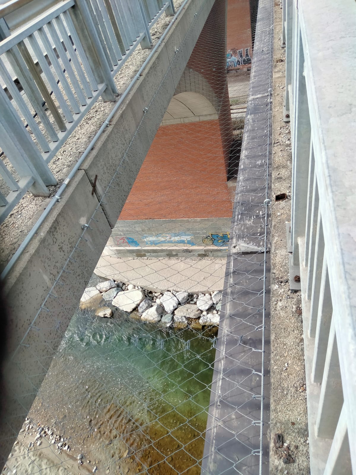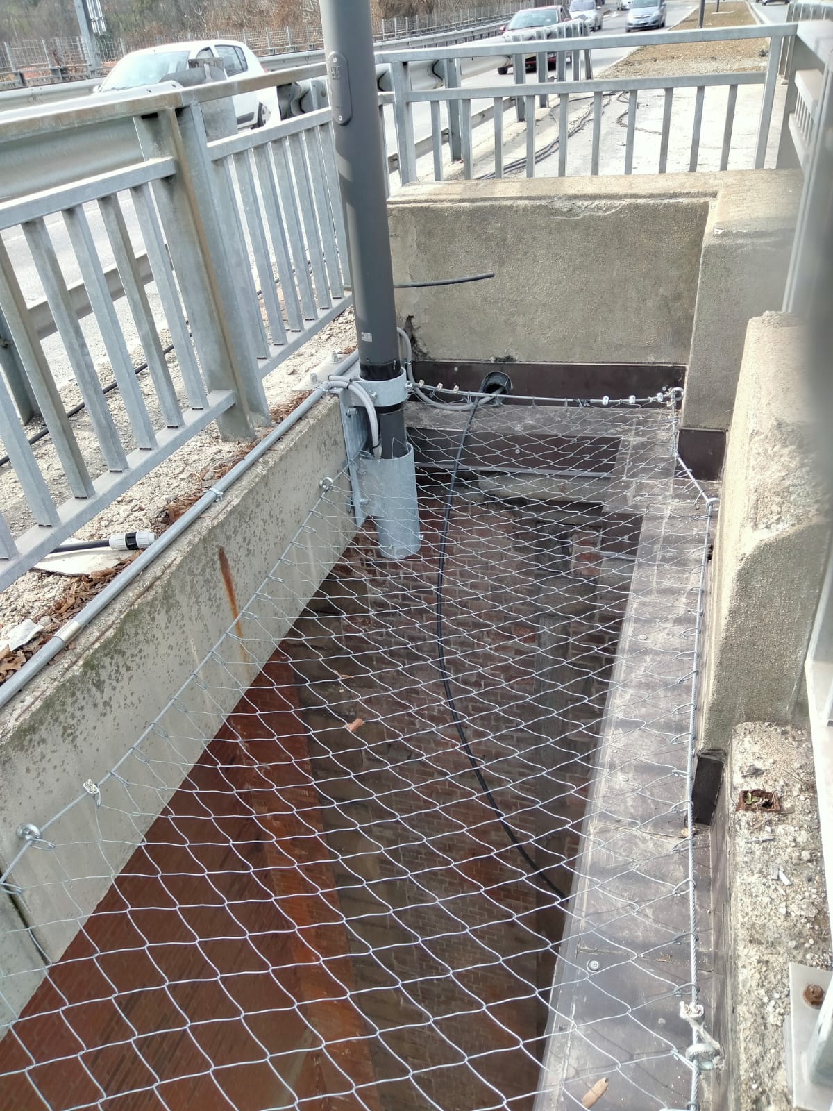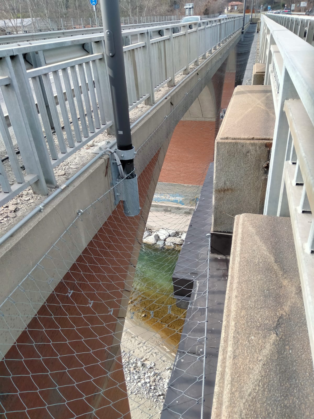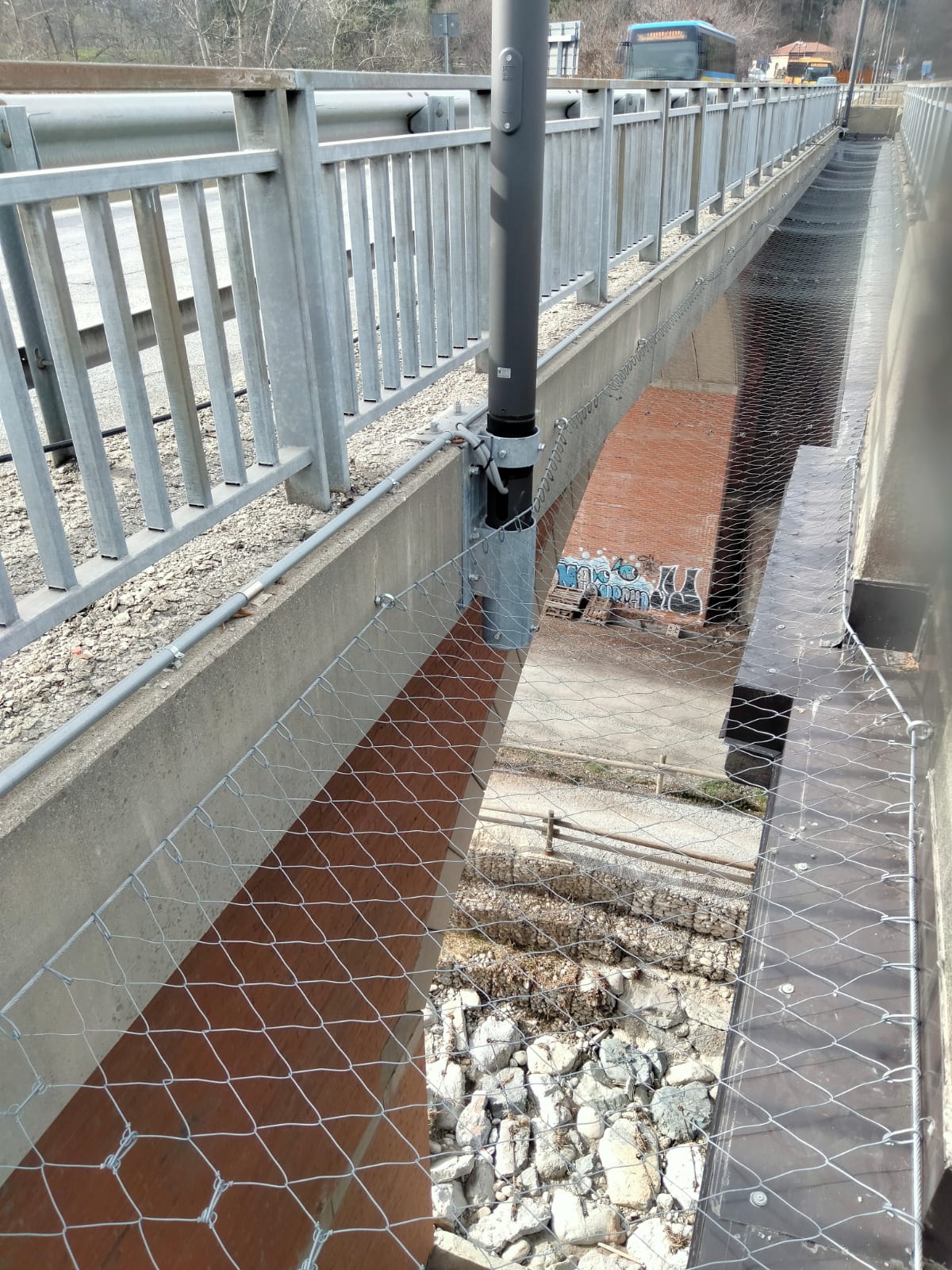 Situazione: Il ponte monumentale è costituito da due corsie parallele con la presenza di una superficie vuota in mezzo, la richiesta era la protezione dalla caduta dall’alto di materiale, persone e parti di auto a seguito di incidenti. E’ stato proposto il sistema di protezione collettiva permanente Deltaxasfe costituito da rete metallica anticaduta ad elevate prestazioni e durata nel tempo garntita, il sistema rete metallica essendo pedonabile da la possibilità agli operatori di accedere e camminare sopra la rete per rimuovere parti di auto incidentate e permette la manutenzione della zona, anche in questo caso il sistema rete metallica permanente pedonabile certificata CE è stata vincente. La rete metallica permanete anticaduta Deltaxsafe viene utilizzata in ambito di viadotti, ponti per la realizzazione di protezioni anticaduta orizzonatli e verticali contro la caduta dall’alto di personale addetto alle manutenzioni e materiale vario, la rete deltaxsafe ha una durata garantita di almeno 20 anni.
